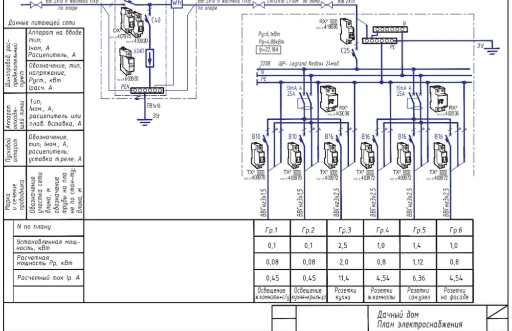 Согласно законодательству России владельцы жилых зданий, где потребляемая мощность не превышает 15 кВт, могут не составлять проект электросетей. Но все-таки в компанию ― поставщика электроэнергии, предоставить схему и информацию о суммарной мощности потребления понадобится. Это необходимо, чтобы подсчитать выделенную мощность на линии и установить приборы учета.