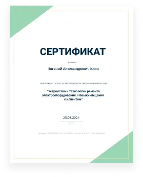 Мастер электрик Евгений Александрович Клин является квалифицированным специалистом Компании «МБР-Групп. Ежегодно проходит курсы подтверждения и повышения квалификации. Нашими клиентами Евгений Александрович Клин характеризуется как тактичный мастер своего дела. Оставьте свой номер телефона и Мастер электрик Евгений Александрович Клин Вам перезвонит.