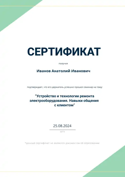 Мастер электрик Иванов Анатолий Иванович является квалифицированным специалистом Компании «МБР-Групп. Ежегодно проходит курсы подтверждения и повышения квалификации. Нашими клиентами Иванов Анатолий Иванович характеризуется как тактичный мастер своего дела. Оставьте свой номер телефона и Мастер электрик Иванов Анатолий Иванович Вам перезвонит.