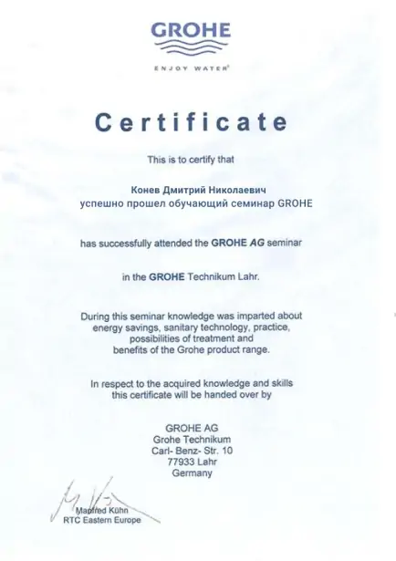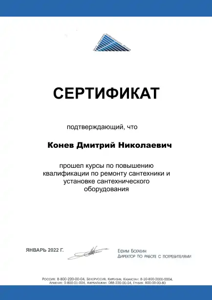 Мастер сантехник Конев Дмитрий Николаевич является квалифицированным специалистом Компании «МБР-Групп. Ежегодно проходит курсы подтверждения и повышения квалификации. Нашими клиентами Конев Дмитрий Николаевич характеризуется как тактичный мастер своего дела. Оставьте свой номер телефона и Мастер сантехник Конев Дмитрий Николаевич Вам перезвонит.